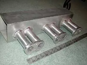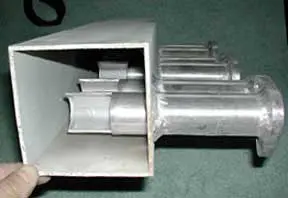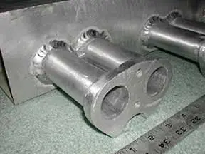 The manifold project is still alive. Winter has been mild here in the Northeast but even mild is pretty cold out in the garage. Recently I turned some aluminium injector sockets that will be welded to the air box. Tonight I welded three of them in place and the ends onto the air box. This weekend I’ll make two more sockets and weld them in place. It’s been years since I did much TIG welding. Back then I could usually get presentable welds but since restarting recently they are strong and solid but not nearly as pretty as I’d like. By the time I welded on the third socket tonight I could see that it was coming back a little. Too bad this little project will be done before I get in much practice. The really ugly welds will get the old hide them by grinding treatment. These pictures show the aluminum sockets and the brass insert used to hold the socket in place for welding. The second picture shows the profile of the fuel rail blank. The cups in the rail will be located and drilled on a friend’s Bridgeport milling machine. The cups need to be accurate to line up with the injector sockets and especially not leak fuel. I won’t embarass myself with any manifold pictures till the welds are cleaned up. Last month another throttle body was donated to my growing collection. This one is a 55mm unit from a 5.0L Ford. Still undecided as to which throttle body to use.