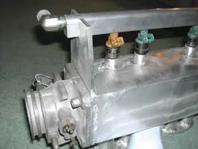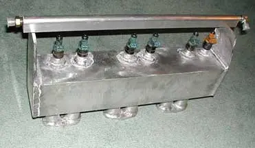 Tonight I finished welding the injector sockets to the air box. My TIG welding is getting a tad better but I still need a lot of practice. On Friday I purchased a pneumatic die grinder with a couple of carbide burrs capable of hiding some of those welds. This picture is of the air box with some injectors resting in place. The manifold ends need to be relieved to accept the fuel rail. The rail is just sitting atop the tabs. It still needs to be drilled to accept the injectors. The rail ends are now tapped to accept 1/4″ pipe fittings. I hope to drill the rail this coming weekend.
